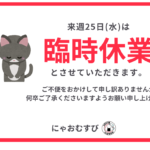 いつもにゃおむすびをご利用いただき、誠にありがとうございます。 誠に勝手ながら、2月25日(水)は臨時休業とさせていただきます。 ご来店を予定してくださっていたお客様にはご不便をおかけいたしますが、何卒ご理解のほどよろし […] - メニュー内容変更のお知らせいつもにゃおすびをご利用くださりありがとうございます。少し見やすく、少し選びやすく🍙こちらは 価格を一部見直した後のメニュー表 になります。 原材料の高騰などもあり調整させていただきましたが、これからも変わらず、ひとつひ […]